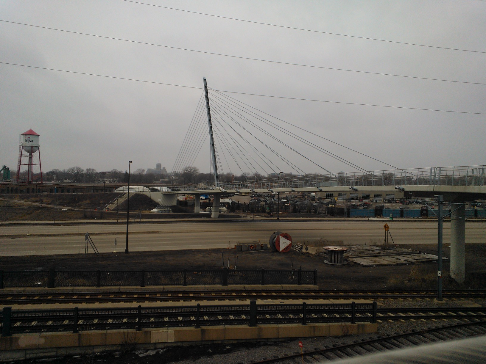 A graceful suspension bicycle span over the railroad tracks provides a lyrical focal point on the skyline.