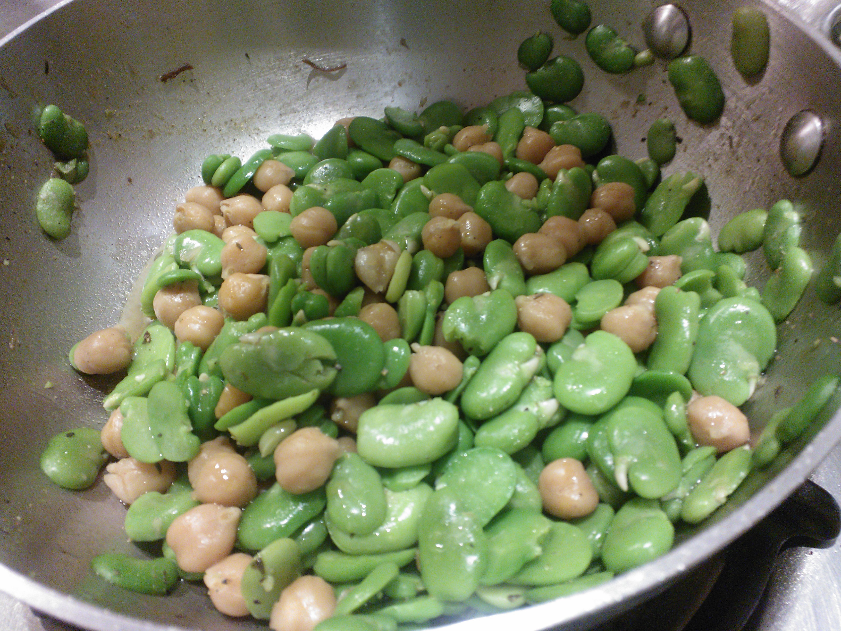 Cook for about 2 minutes over a lowish flame.  Next add the prepped fava beans and toss, toss, toss.  Warm up together