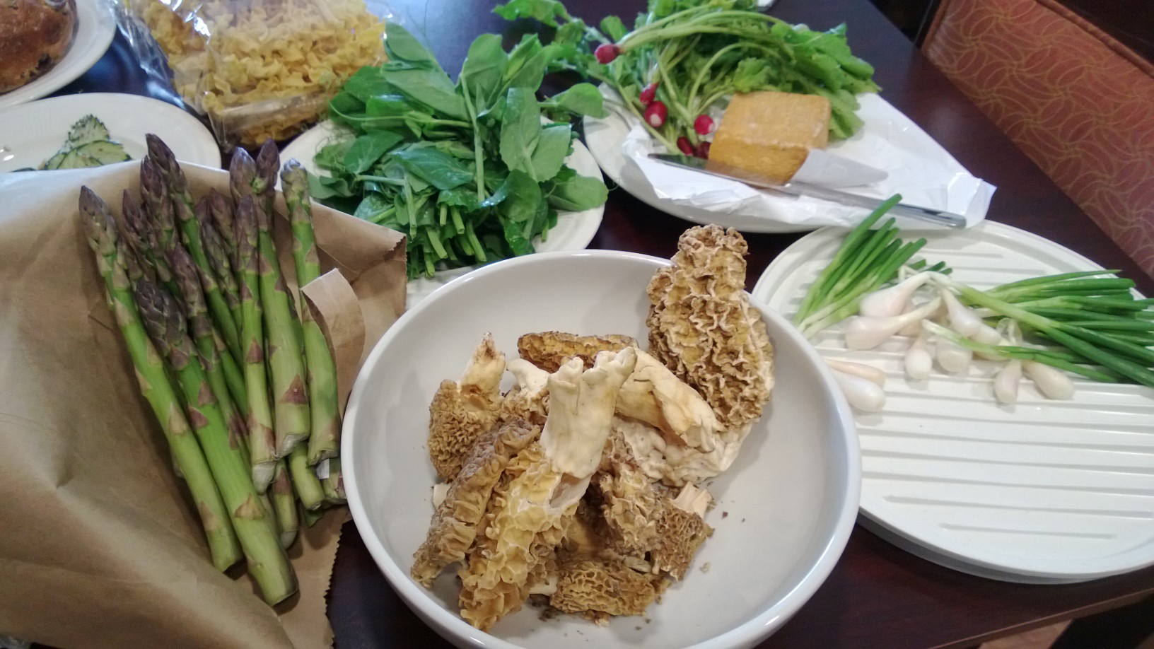 What really drove me to scour the market were locally foraged morel mushrooms.  Generally a rite of spring in the north Midwest and Western states this mushroom is a bit different than its many cousins. Our friends at Wikipedia who seem to have a listing for darn near everything offer that ” the genus Morchella is derived from morchel, an old German word for mushroom, while morel itself is derived from the Latin maurus meaning brown.”  There, now you know. Its distinct conical shape, heavily convoluted sets it apart from other mushrooms and the flavor leans towards woodsy with high notes of complex mushroom that you most often experience thru the olfactory senses as you exhale when eating them.  Delicate but pervasive. Awesome with a medium weight but developed red wine, and good company.