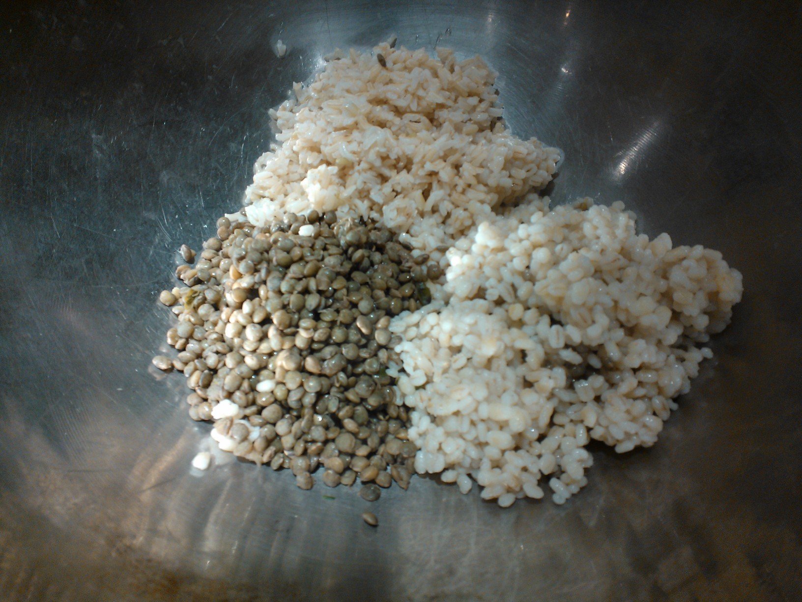 The hardest part of this is that you have to cook the lentils, rice and barley separately. Place each in a small separate pot. Add 21/2 cups water and bring to simmer. Cook each until done. This will take approx 20- 22 minutes for the lentils and approx. 15-18 minutes for the barley and rice. Take care not to over cook so taste them several times towards the end of the cooking time. Time will vary a bit. When done drain each of all water and let let in a colander for a few minutes then combine in a large bowl.