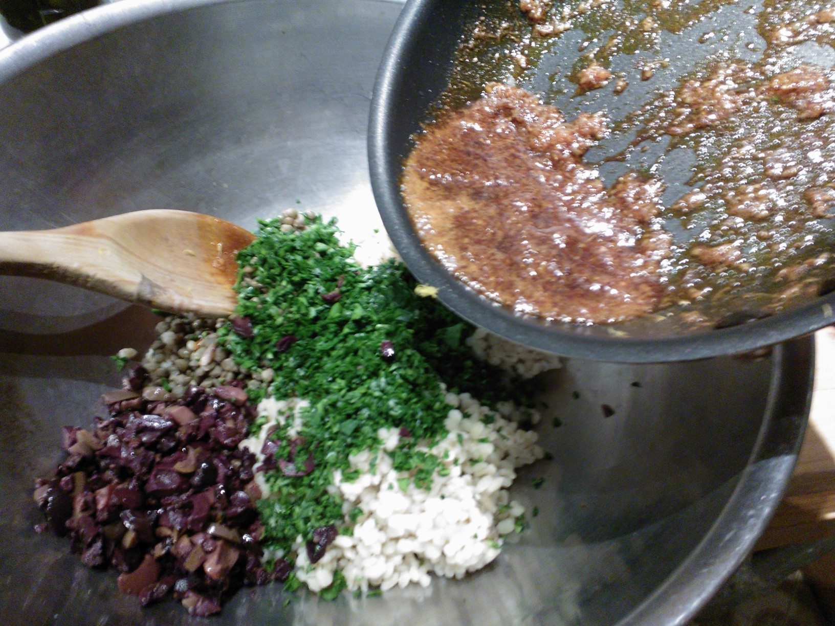 In a small sauce pan heat the olive oil. Add the onion and garlic and cook slowly for 3 minutes stirring occasionally. Next add the Ras el_hanout and stir well. Let this cook slowly for a minute then pull off the heat and pour over the grain, rice, lentil mix. Stir in then add the lemon zest, juice, salt and chopped parsley. Lastly add the olives and chopped almonds.