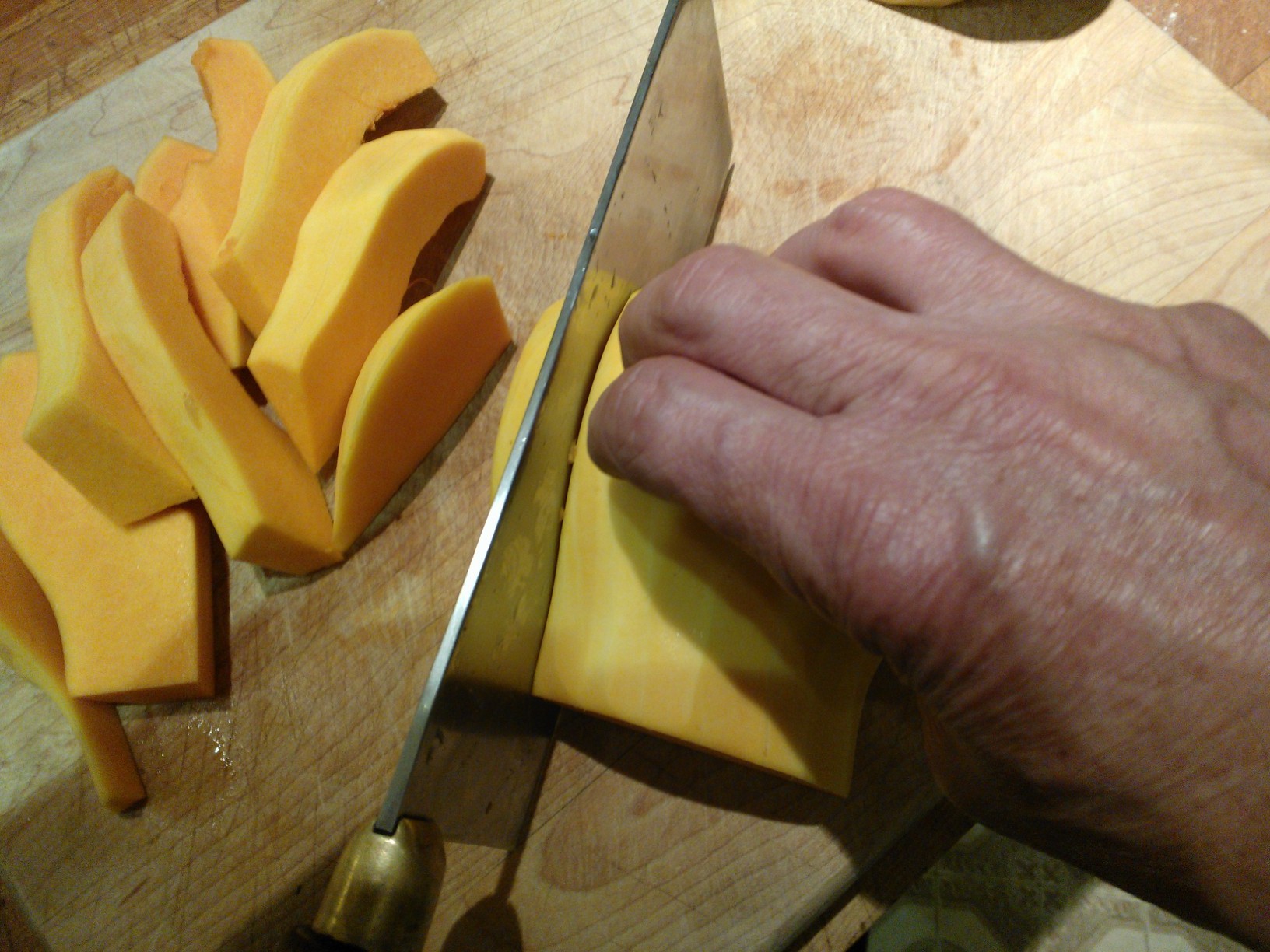 Cutting and Prepping – Cooking of any sort almost invariably involves some slicing and dicing.  Rule #1: Have sharp knives.  They don’t need to be the most expensive, fanciest ones out there but please make sure they as heck need to do the job.  It’s really like having a good pair of running shoes, tuned up orthotics, your bike in good riding order.  One skill to work on and develop is the happy crab hand.